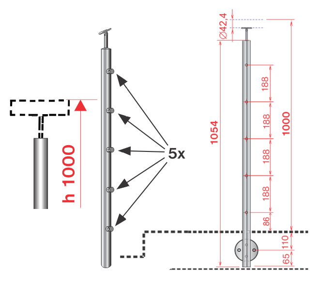 Stalp inox AB100-5D12 cu 5 intermediare pentru teava Ø12 mm cu prindere pe lateral